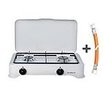 Details: 2 flammiger Propan Haushaltskocher/Gaskocher mit Gusstopfträger und Guss-Brennerdeckel emailliert/für den Innenraum zugelassen (Hockekocher, Kocher, Gastrokocher, Gasherd, parker, Campingkocher)