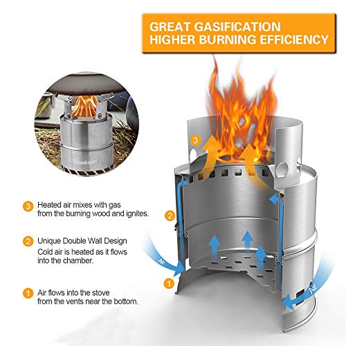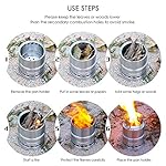 ?【Umweltfreundlich】 – Der Holzofen verwendet Äste, Blätter und Hölzer als Brennstoff, der überall leicht zu bekommen ist. Kochen Sie eine Mahlzeit mit den Zweigen, die Sie auf Ihrer Wanderung sammeln. Verabschieden Sie sich von schweren, teuren und umweltschädlichen Kraftstoffen.