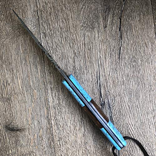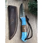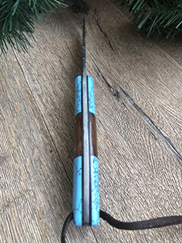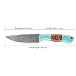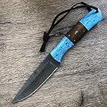 Details: Hobby Hut HH-409, handgemachtes Bushcraft Damaskus Stahlmesser | Lederscheide, Holz und Türkis Griff | Festehnدهندی