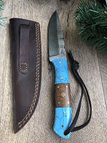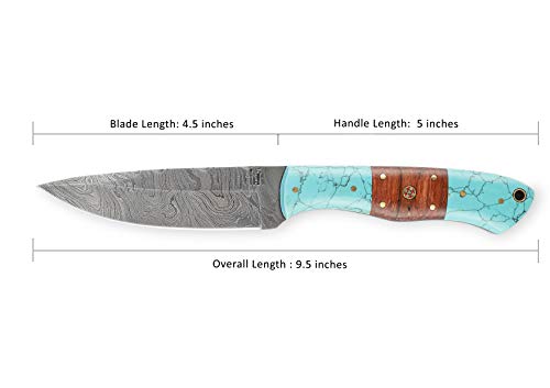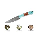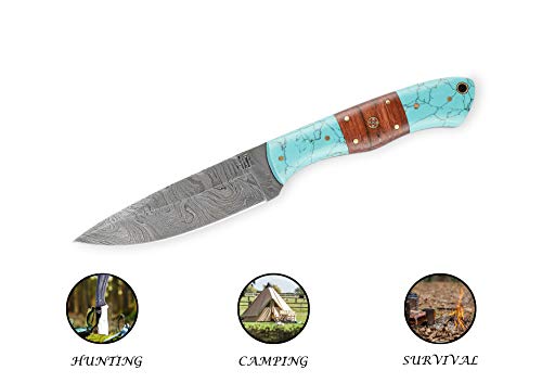 Hobby Hut HH-409, handgemachtes Bushcraft Damaskus Stahlmesser | Lederscheide, Holz und Türkis Griff | Festehnدهندی