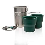 Das ADVENTURE CAMP COOK SET von Stanley besteht aus einem kleinen, 0,7 Liter fassenden Kochtopf aus rostfreiem 8/18 Edelstahl sowie aus zwei ineinander stapelbaren, isolierten 0,3 Liter Bechern aus Kunststoff. Zum Kochtopf gehört ein Deckel, welcher mit Löchern zum Entweichen von Dampf und einem Griff zum gefahrlosen Öffnen versehen ist. Der Griff des Topfes sichert während des Transports den Deckel und somit auch die im Innenraum untergebrachten Becher. Alle Teile können in der Spülmaschine gereinigt werden und sind BPA frei. Fassungsvermögen: 709 ml Höhe: 15 cm Leergewicht: 395 g